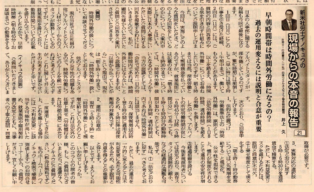 現在は「朝5時~7時まで」を、「時間外労働」扱いとしております。
